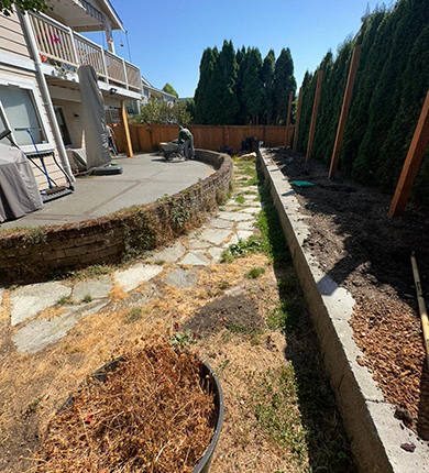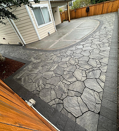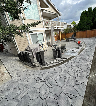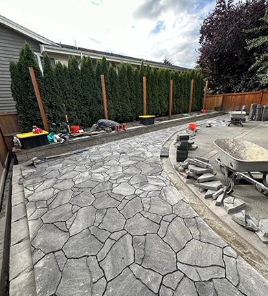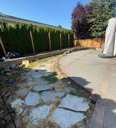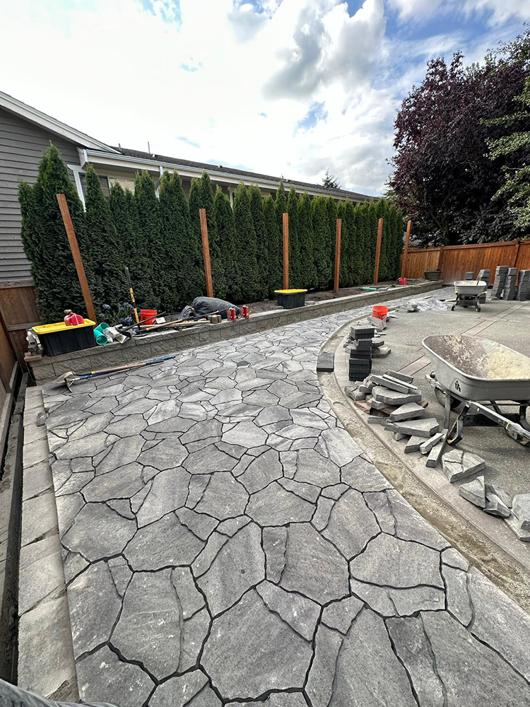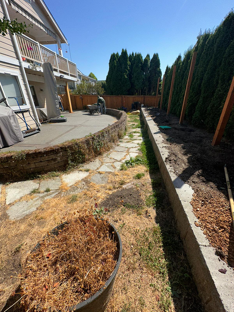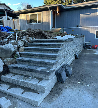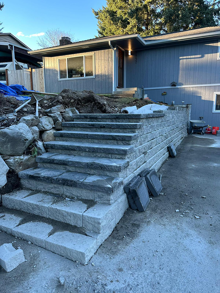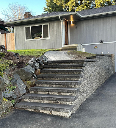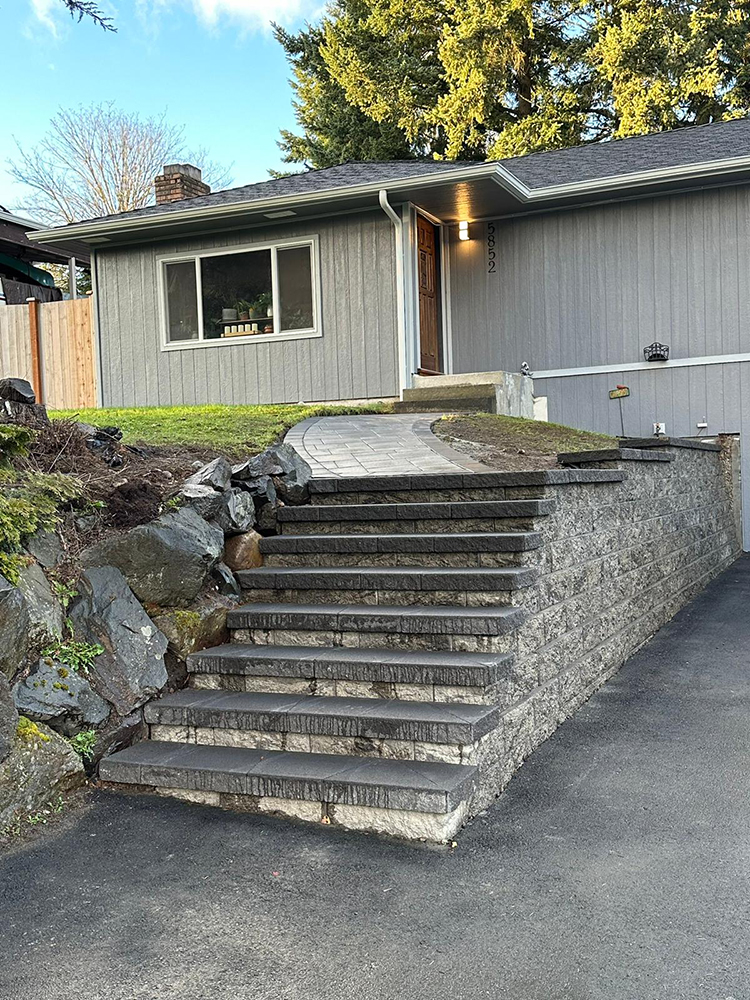 Expert construction and design services in Edmonds, WA. This project features a block retaining wall with integrated steps, and a beautifully crafted paver patio and walkway.