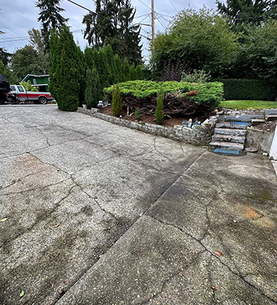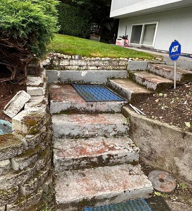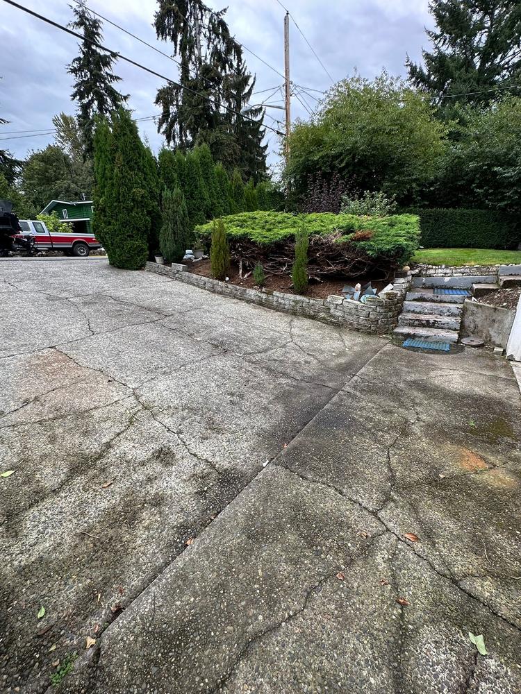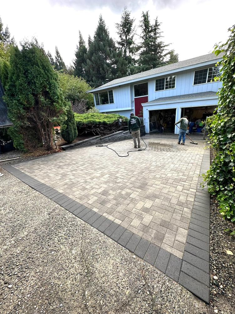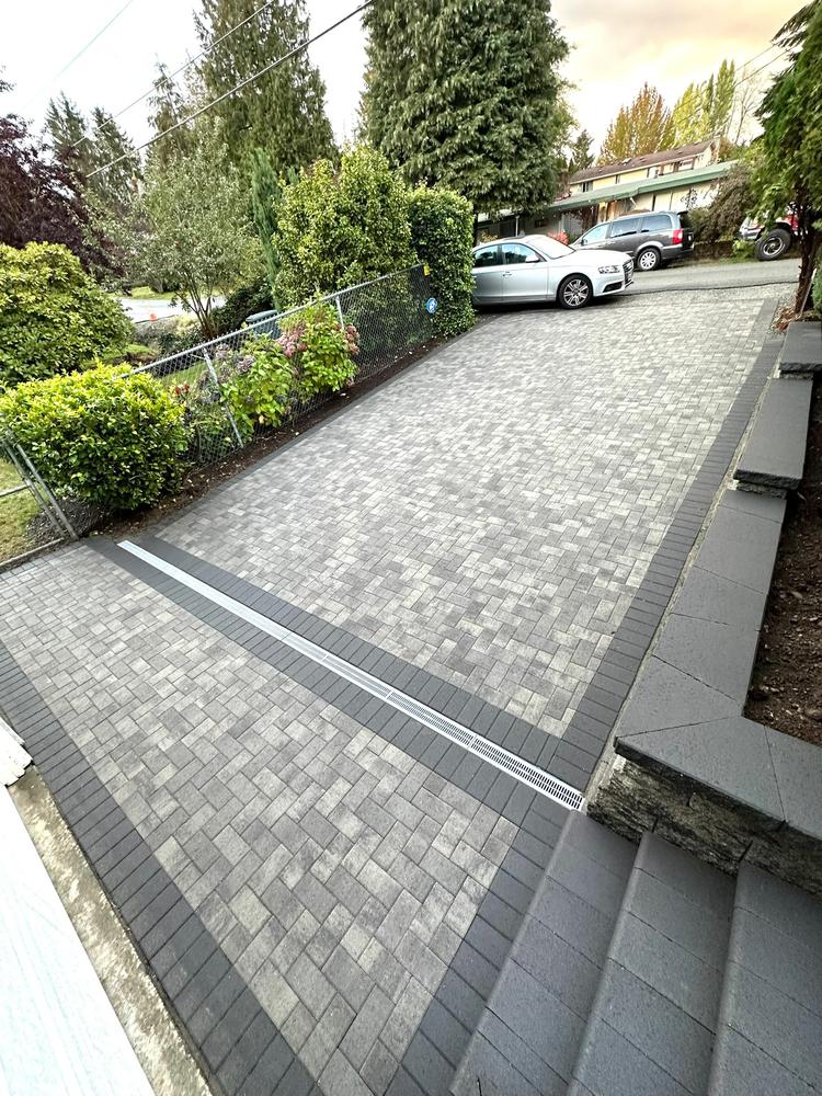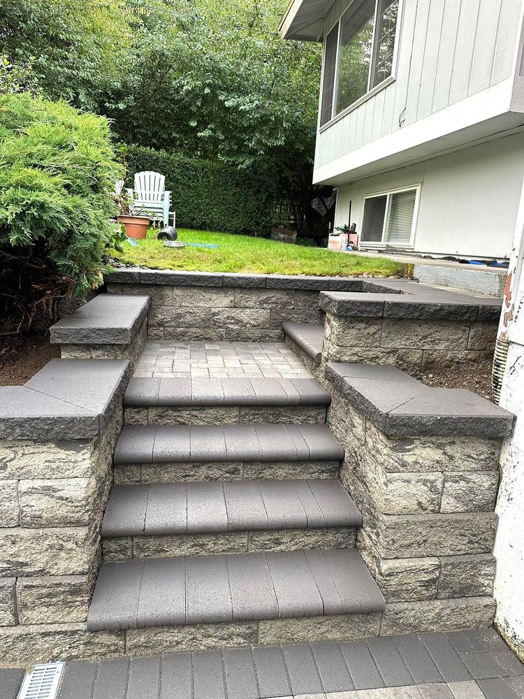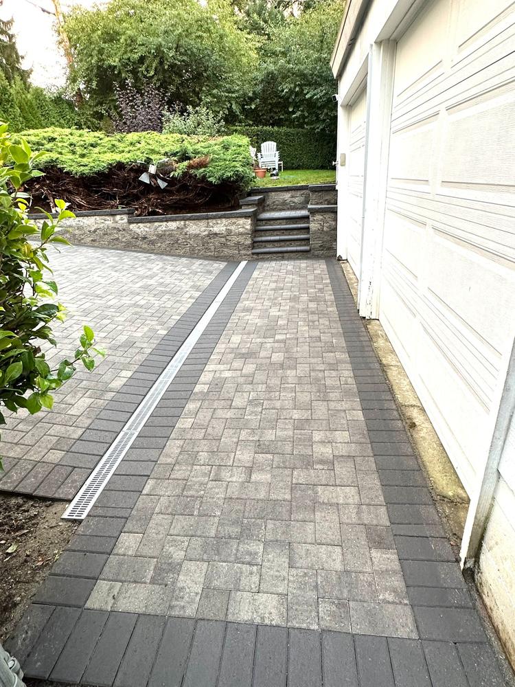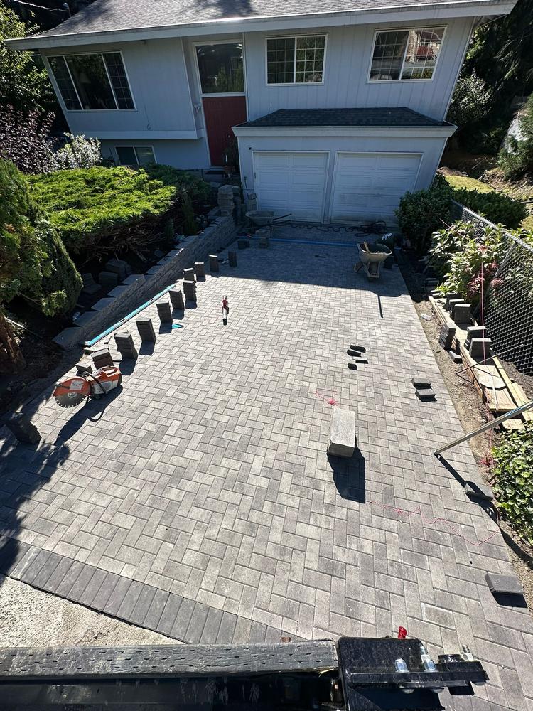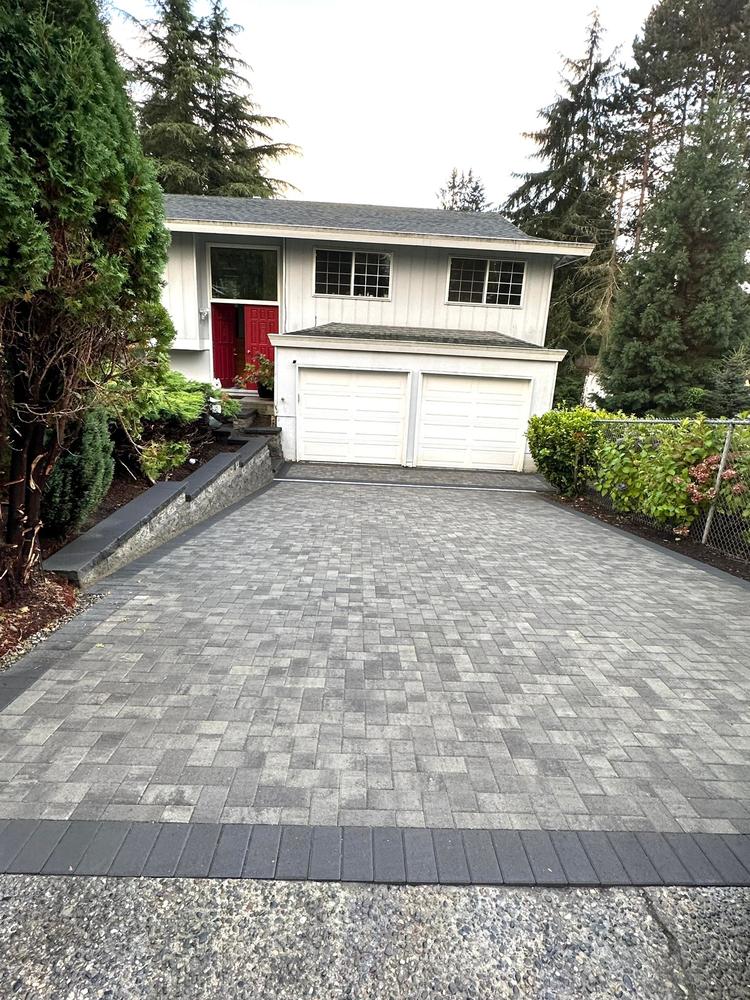 Explore a stunning transformation in Kenmore, WA featuring a beautifully designed paver driveway, removal of old concrete, installation of a new drainage system, construction of a sturdy block wall and natural stone steps.