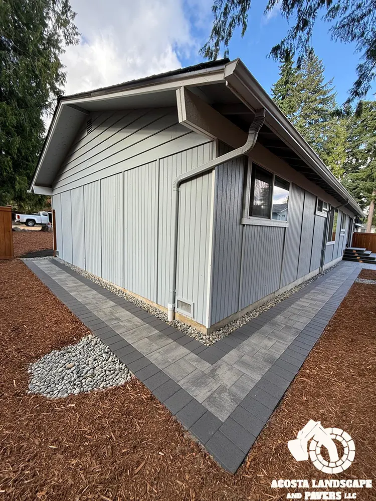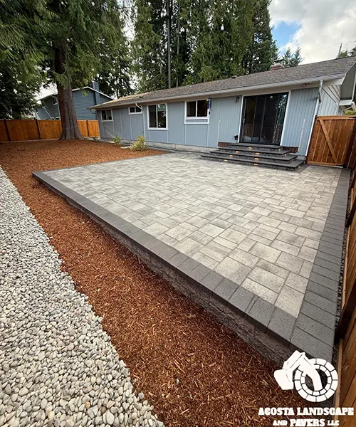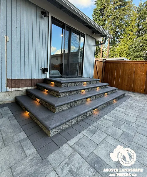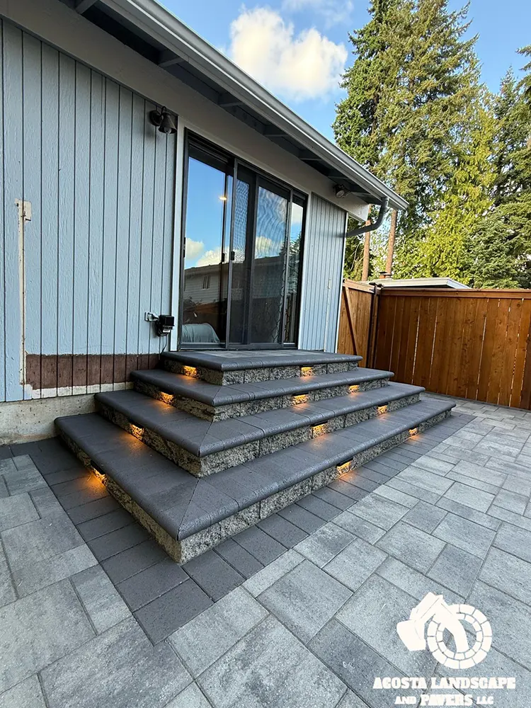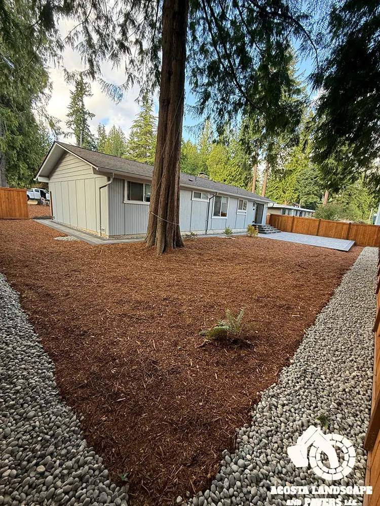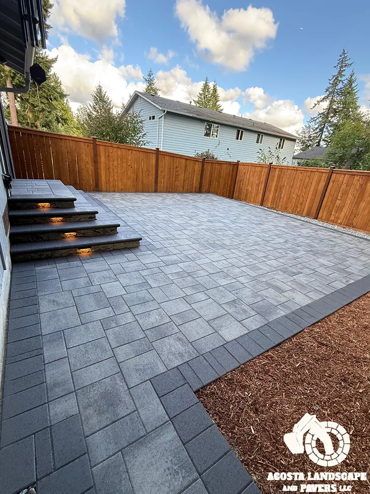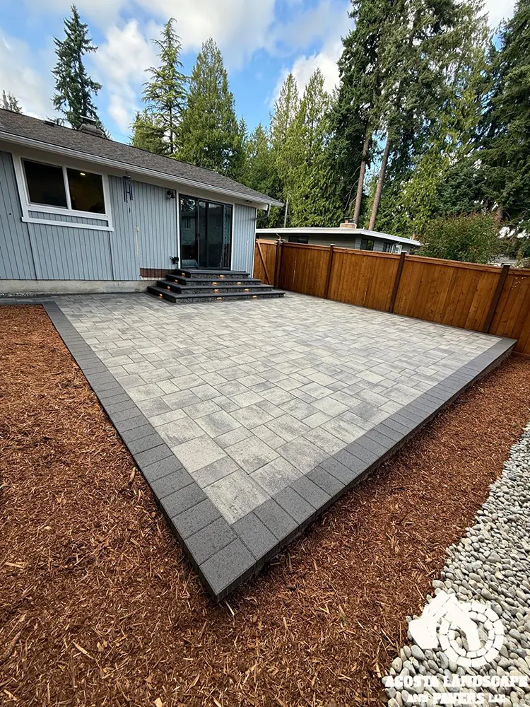 This project transformed a Shoreline backyard into a beautiful and functional space. We began by removing old stumps and roots, then installed a new paver patio, steps, and a connecting walkway. To complete the design, we added fresh mulch throughout the yard and installed lights on the steps for added safety and ambiance.