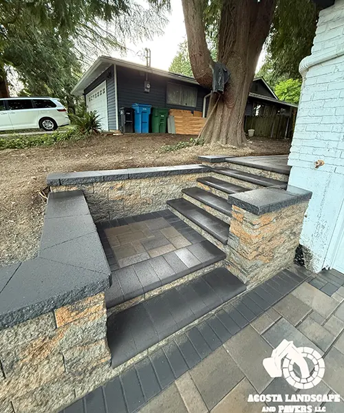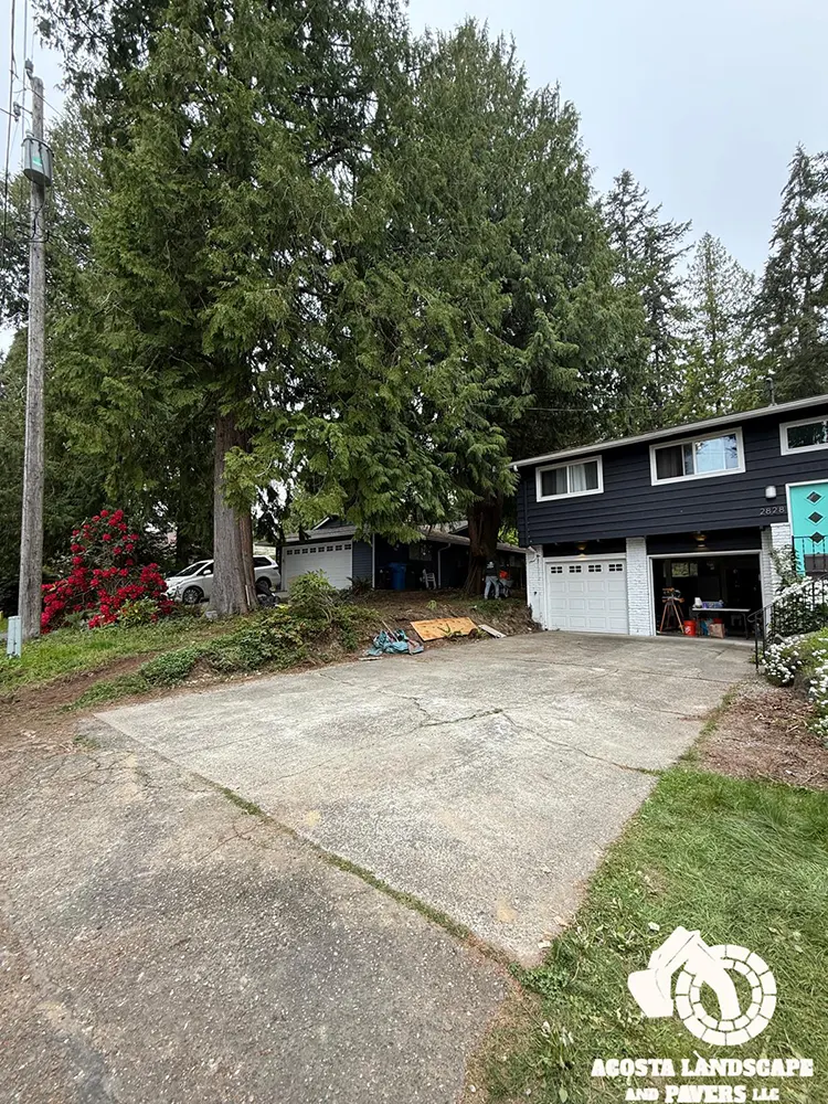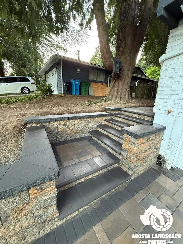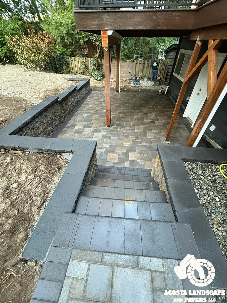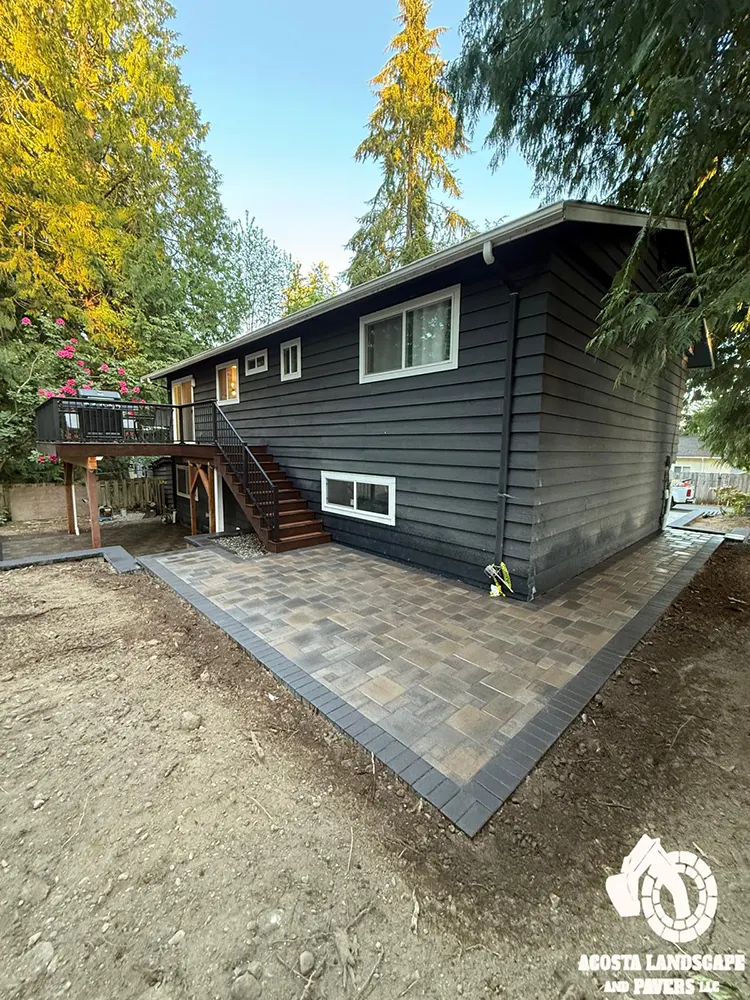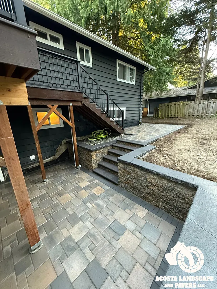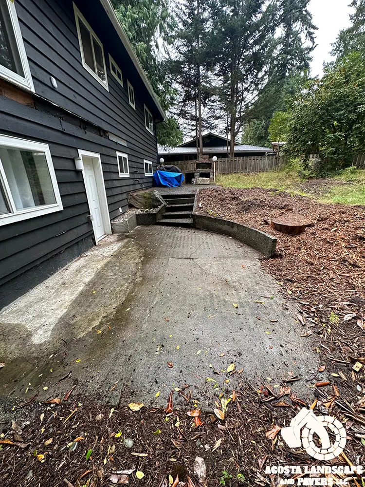 This project completely revitalized a Shoreline home. We removed the old concrete driveway and installed new pavers, then built new steps and walkways. The backyard was transformed with a new patio, retaining walls, and steps, plus a brand new deck, creating a cohesive and functional outdoor living space.